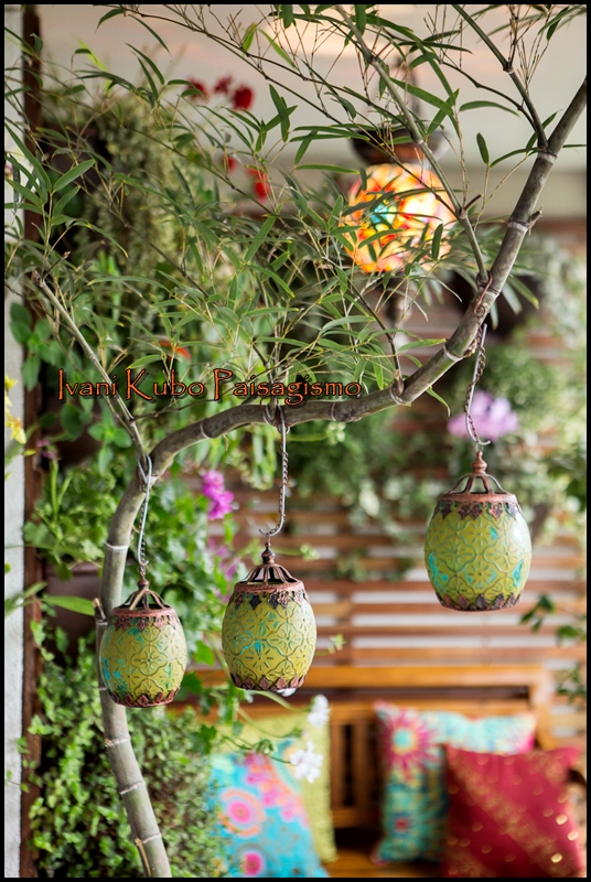 Luminárias turcas, fonte d'água, deque, pratinhos de parede, azulejos próximos à churrasqueira, iluminação cênica, banquetas de porcelana, enfim, tudo para alegrar e colorir o ambiente.